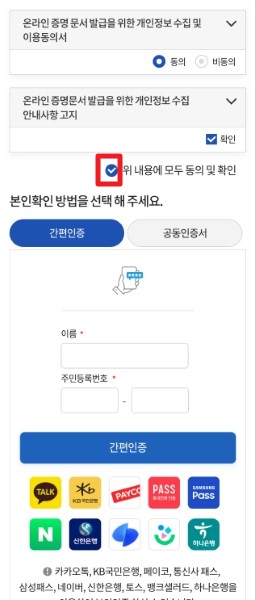 3. 개인정보 동의 체크 > 간편인증서 또는 공동인증서(구 공인인증서)를 이용한 본인인증