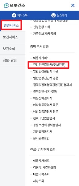 2. [전체메뉴] > [민원서비스] > [건강검진결과서(구 보건증)]