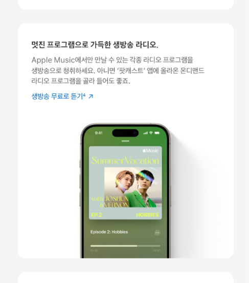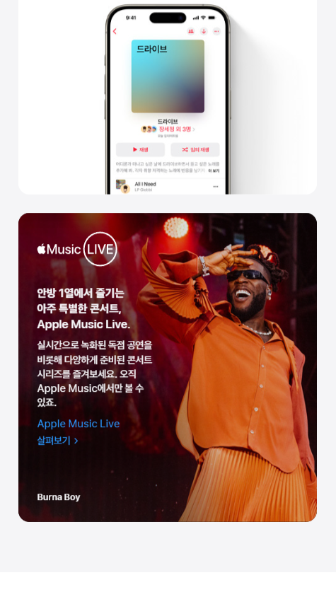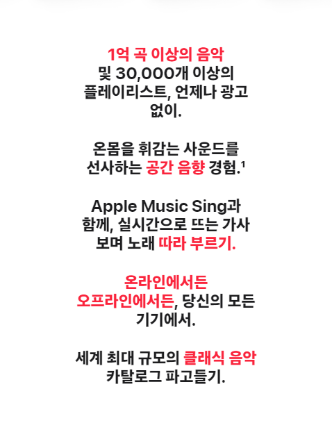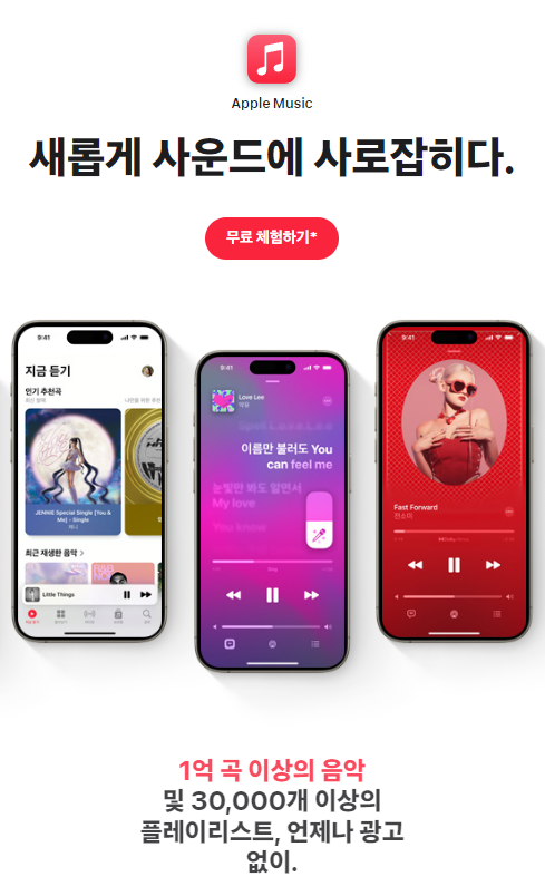 애플뮤직에서는 1억 곡 이상의 다양한 음악과 30,000개가 넘는 플레이리스트를 광고 없이 즐기실 수 있습니다.