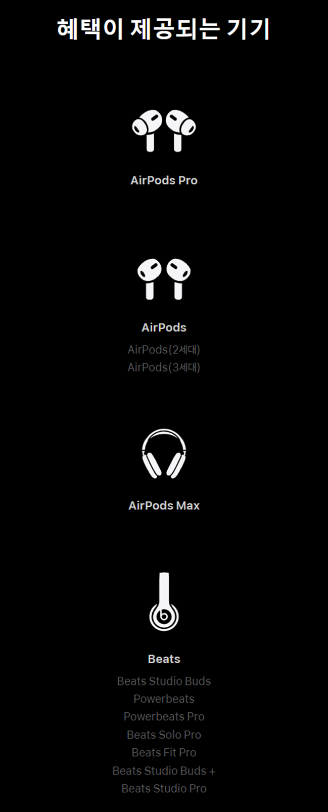 - 혜택이 제공되는 오디오 기기: AirPods Pro, AirPods (2세대, 3세대), AirPods Max, Beats Fit Pro, Beats Studio Buds, Powerbeats, Powerbeats Pro, Beats Solo Pro, Beats Studio Buds +, Beats Studio Pro