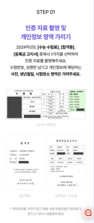 - 인증 자료 촬영 (택 1: 2024학년도 수능 수험표, 합격증, 등록금 고지서)