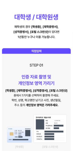 - 인증 자료 촬영 (택 1: 학생증, 재학증명서, 성적증명서, 포털 스크린숏)